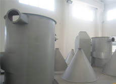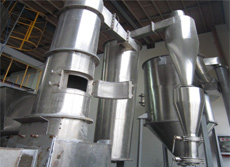 空氣經(jīng)過加熱器被加熱至~230℃左右,進入旋轉(zhuǎn)閃蒸干燥機。濕料由輸送裝置送入螺旋加料機構(gòu),螺旋加料器可無級調(diào)速。物料經(jīng)擠壓后強制進入主塔,隨即被高速旋轉(zhuǎn)而又具有不同角度的刀片粉碎,又被高速進入旋轉(zhuǎn)閃蒸干燥機主塔的高溫氣流沖擊高速旋轉(zhuǎn)、夾帶上升,這時氣流溫度急速下降,物料水分迅速蒸發(fā)從而完成干燥過程。被干燥的物料隨高速高溫氣流進入脈沖布袋除塵器。氣流由濾袋外部進入,向上排出,為防止濾袋積料,由脈沖電磁閥定時、輪流由各濾袋上部輸入高壓氣流(0.5~0.6Mpa),反復反沖濾袋,以達到*佳除塵效果。