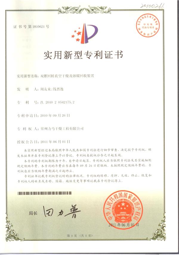 雙錐回轉(zhuǎn)真空及溶媒回收裝置專利證書