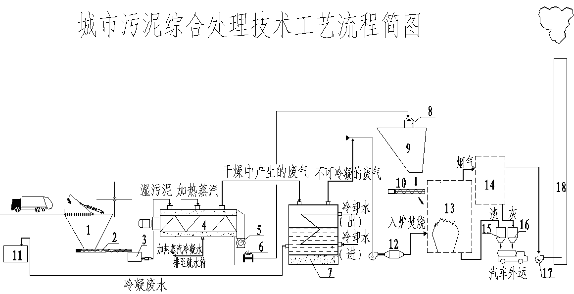 1.污泥倉 2.污泥取料機 3.污泥給料機 4.污泥烘干機 5污泥出料機 6.皮帶輸送機 7.冷凝器 8.皮帶輸送機(干污泥)9.污泥倉 10.爐前給料機 11.凝結(jié)廢水箱 12.鍋爐送風(fēng)機 13.污泥焚燒爐 14.煙氣處理系統(tǒng) 15.渣倉 16.灰倉 17.引風(fēng)機 18.煙囪